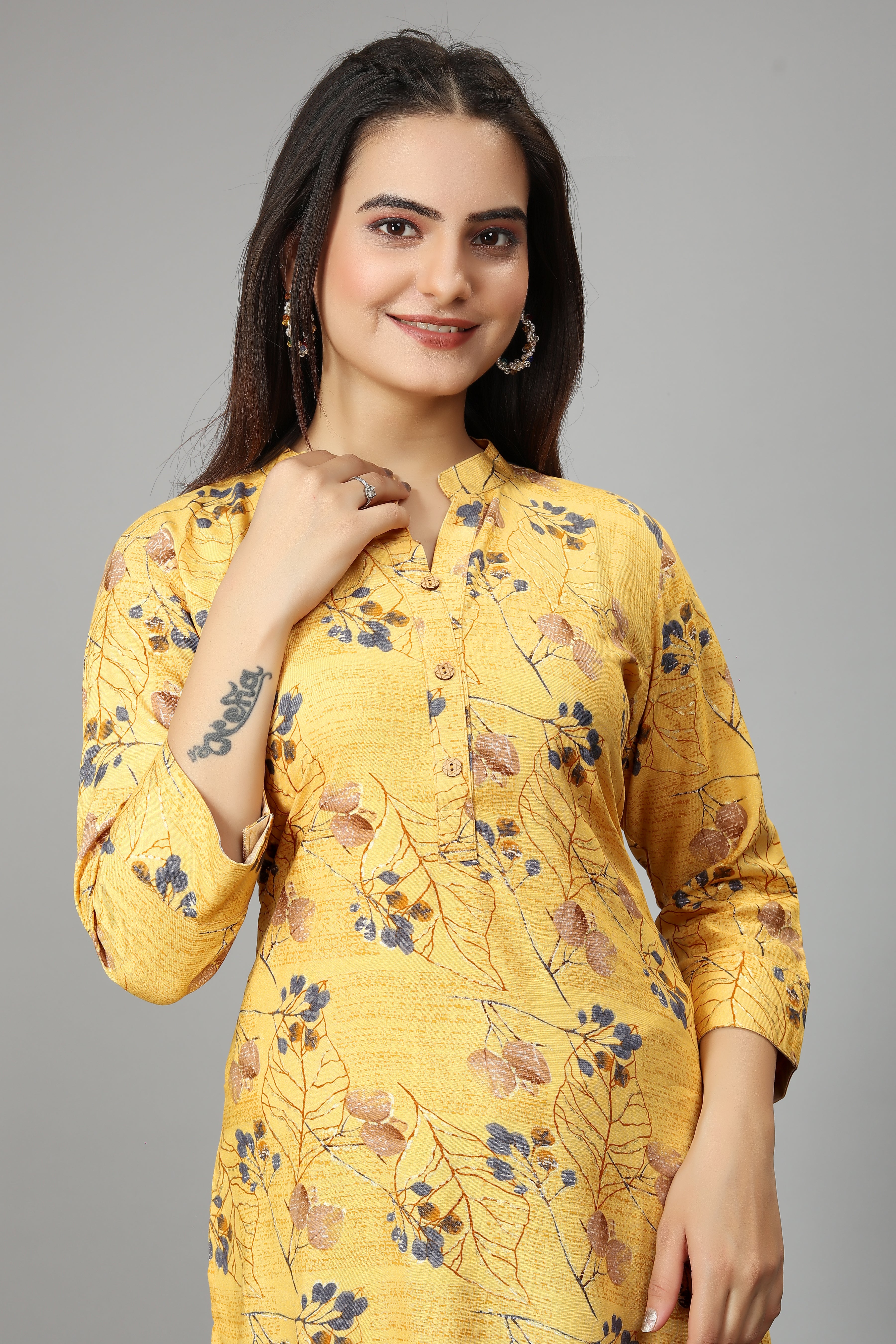 women yellow mandarin neck straight kurti Sale priceRs. 299.00